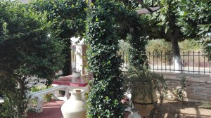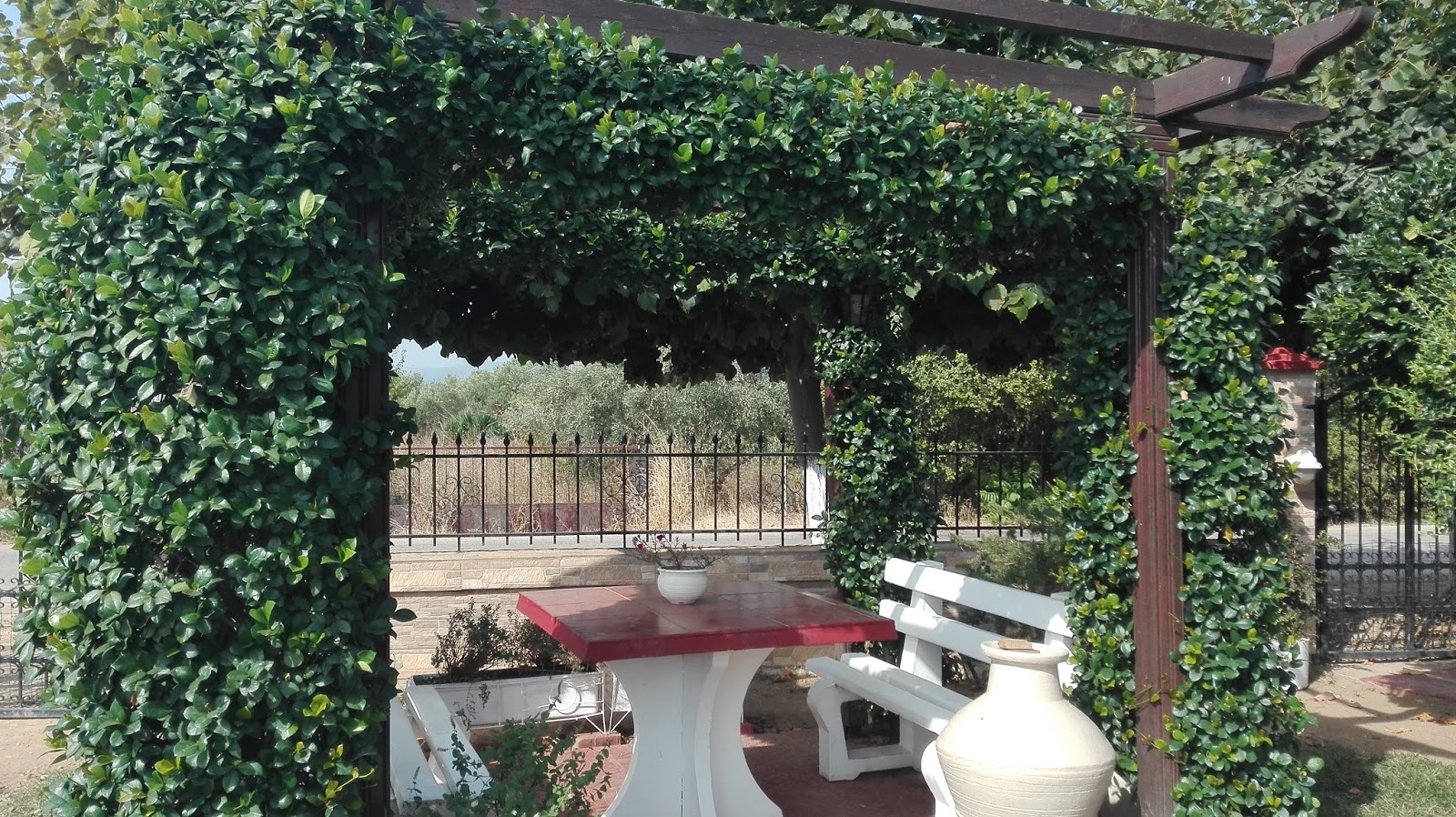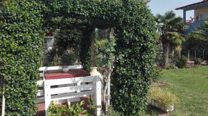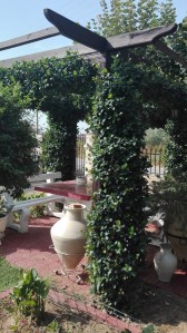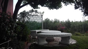 Δυνατό και στιβαρό- κατασκευή από τσιμέντο. Το λευκό χρώμα δίνει μια αίσθηση νεοκλασικού, ενώ η πέργκολα πίσω μια δόση ρομαντισμού… Ενδείκνυται κυρίως, για μουσαφίρηδες που δεν θέλουμε να μας ‘κατσικωθούν’. ή για φίλους- συγγενείς που είναι σε εξαιρετική φόρμα και δεν υποφέρουν από μέση ,αρθριτικά κτλ (πριν ‘στρογγυλοκαθήσουν’ ας αναλάβουν την προσωπική τους ευθύνη ή τουλάχιστον ας βεβαιωθούμε ότι έχουν ασφάλεια σε ισχύ (ΕΟΠΥΥ κτλ).