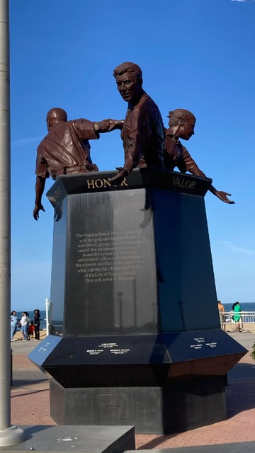 Virginia Beach stands out for its above- average median income and educational attainment, as well as a strong appreciation for cultural activities. However, despite these qualities, the area can’t entirely shake off its kitschy reputation. A prime example of this is the iconic statue of King Neptune, which graces the beach though somewhat out of place, evoking more of a Disneyland vibe than a coastal city. Aside from this, it brings to mind another equally questionable Neptune statue located in the renowned Greek region of Halkidiki. Interestingly, the same sculptor also crafted a memorial honoring members of the Virginia Beach Police Department who lost their lives in the line of duty. This tribute is displayed in the lobby of the Virginia Beach Law Enforcement Training Academy and includes names of those who died, including one officer who succumbed to COVID and a few who were accidentally shot.